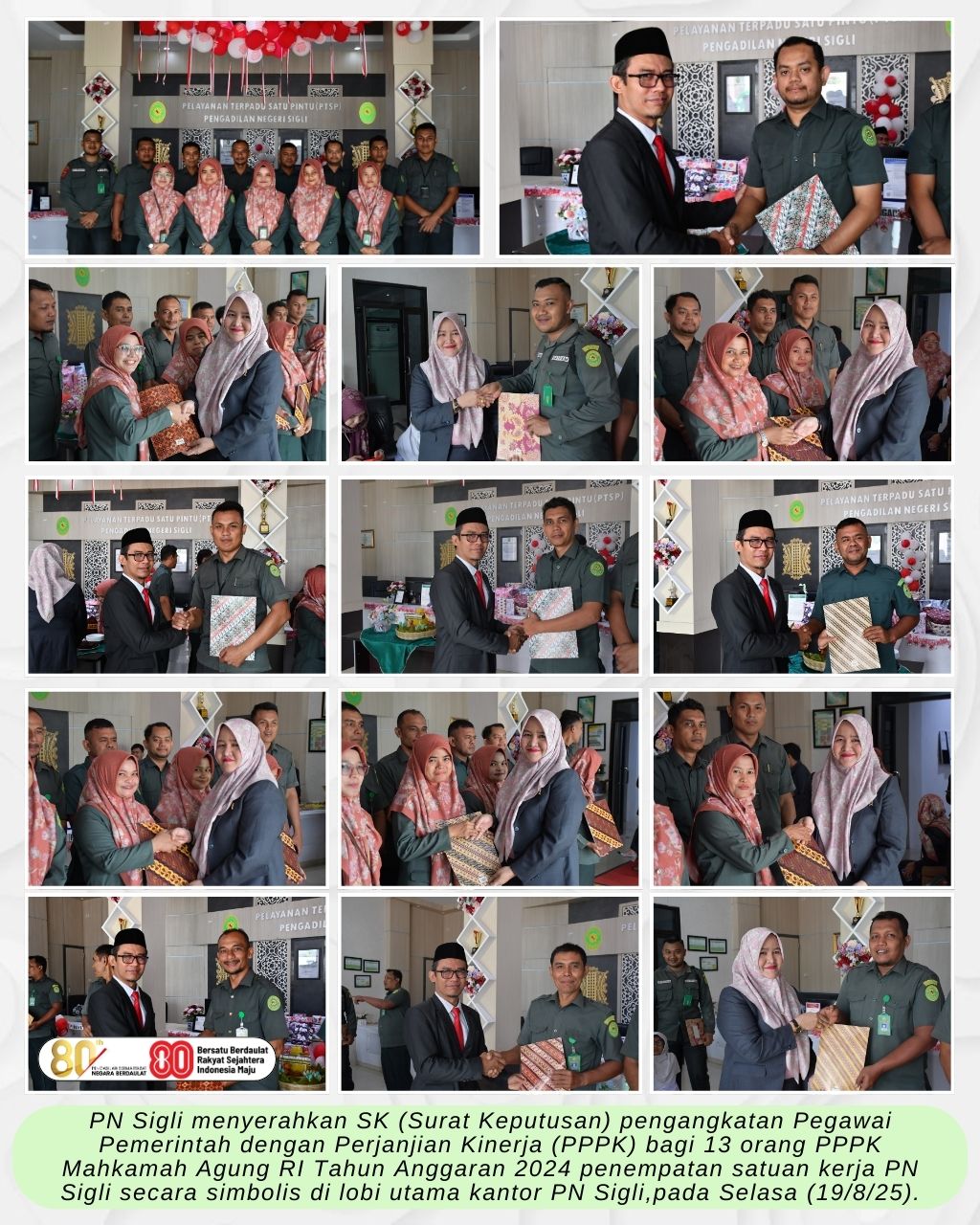 Sigli – Selasa (19/8/25) Pengadilan Negeri Sigli menyerahkan SK (Surat Keputusan) pengangkatan Pegawai Pemerintah dengan Perjanjian Kinerja (PPPK) bagi 13 orang PPPK Mahkamah Agung RI Tahun Anggaran 2024 penempatan satuan kerja Pengadilan Negeri Sigli secara simbolis di lobi utama kantor Pengadilan Negeri Sigli.