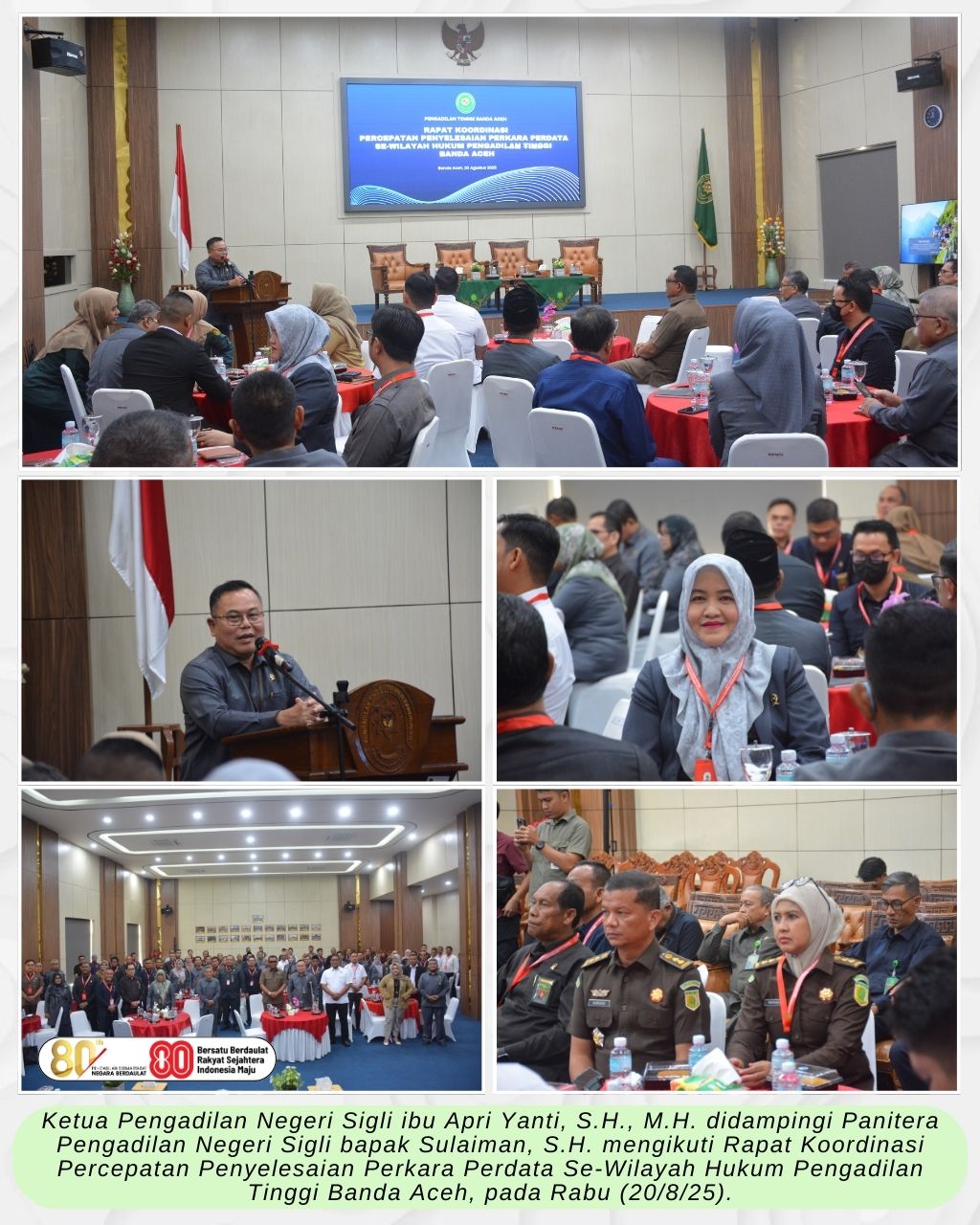 Banda Aceh – Rabu (20/8/25) Ketua Pengadilan Negeri Sigli ibu Apri Yanti, S.H., M.H. didampingi Panitera Pengadilan Negeri Sigli bapak Sulaiman, S.H. mengikuti Rapat Koordinasi Percepatan Penyelesaian Perkara Perdata Se-Wilayah Hukum Pengadilan Tinggi Banda Aceh yang diselenggarakan oleh Pengadilan Tinggi Banda Aceh di ruang Aula Kantor Pengadilan Tinggi Banda Aceh, Banda Aceh.
