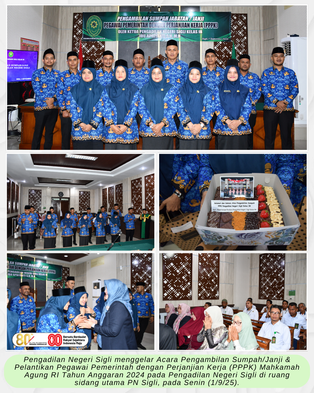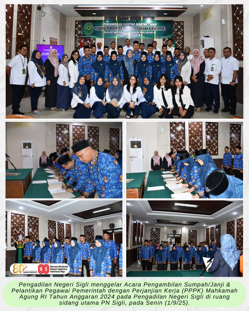 Sigli – Senin (1/9/25), Pengadilan Negeri Sigli menggelar Acara Pengambilan Sumpah/Janji & Pelantikan Pegawai Pemerintah dengan Perjanjian Kerja (PPPK) Mahkamah Agung RI Tahun Anggaran 2024 pada Pengadilan Negeri Sigli di ruang sidang utama PN Sigli.