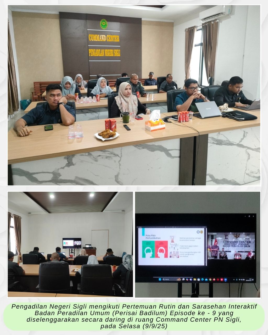 Sigli – Selasa (9/9/25), Pengadilan Negeri Sigli mengikuti Pertemuan Rutin dan Sarasehan Interaktif Badan Peradilan Umum (Perisai Badilum) Episode ke – 9 yang diselenggarakan secara daring di ruang Command Center PN Sigli.