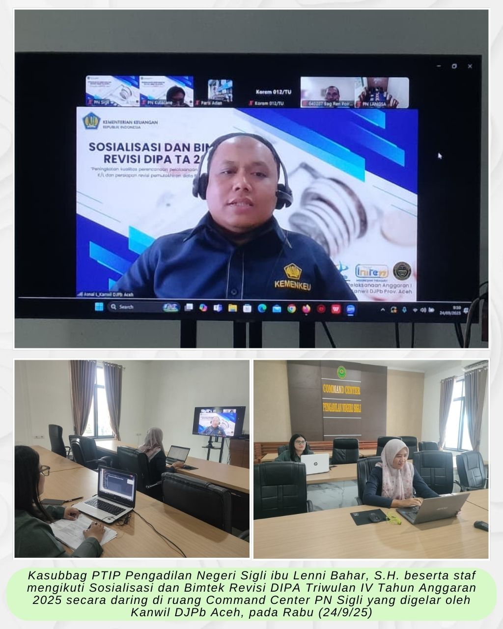 Sigli – Rabu (24/9/25), Kasubbag PTIP Pengadilan Negeri Sigli ibu Lenni Bahar, S.H. beserta staf mengikuti Sosialisasi dan Bimtek Revisi DIPA Triwulan IV Tahun Anggaran 2025 secara daring di ruang Command Center PN Sigli yang digelar oleh Kanwil DJPb Aceh.