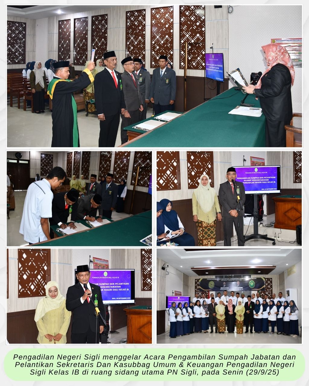 Sigli – Senin (29/9/25), Pengadilan Negeri Sigli menggelar Acara Pengambilan Sumpah Jabatan dan Pelantikan Sekretaris Dan Kasubbag Umum & Keuangan Pengadilan Negeri Sigli Kelas IB di ruang sidang utama PN Sigli.