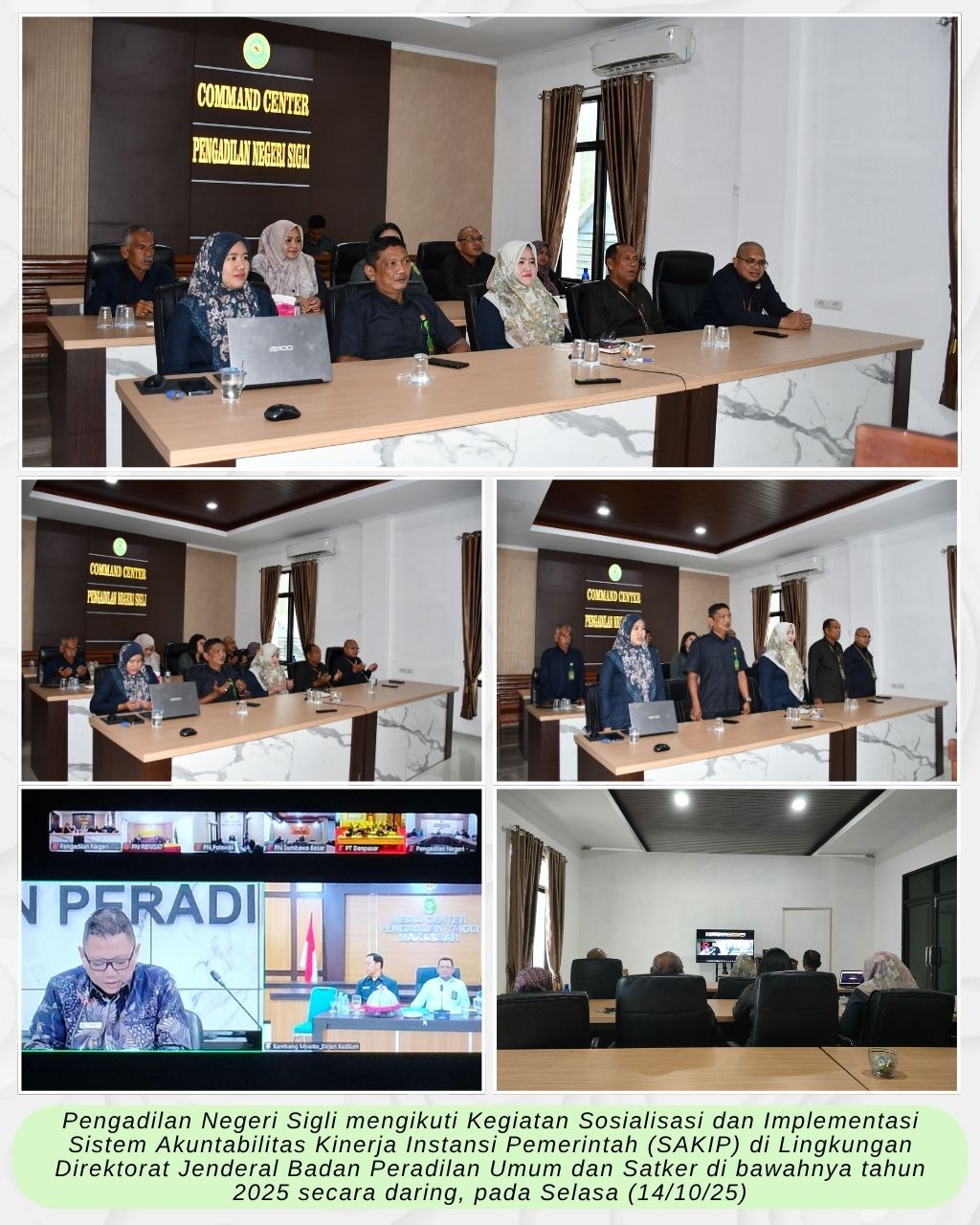 Sigli – Selasa (14/10/25), Pengadilan Negeri Sigli mengikuti Kegiatan Sosialisasi dan Implementasi Sistem Akuntabilitas Kinerja Instansi Pemerintah (SAKIP) di Lingkungan Direktorat Jenderal Badan Peradilan Umum dan Satker di bawahnya tahun 2025 secara daring di ruang Command Center PN Sigli.