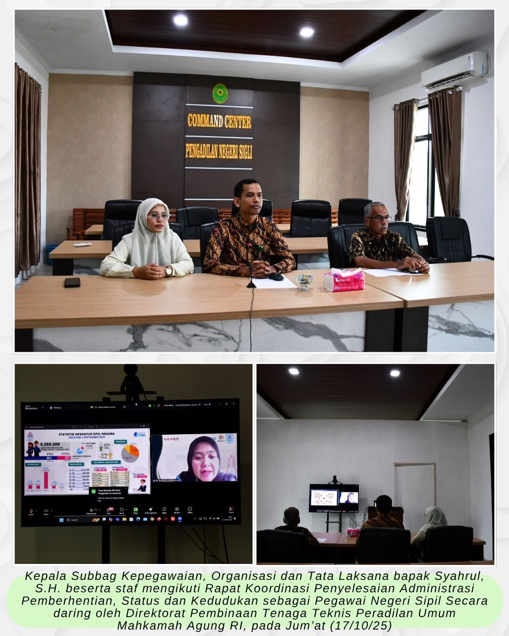 Sigli – Jum’at (17/10/25), Kepala Subbag Kepegawaian, Organisasi dan Tata Laksana Pengadilan Negeri Sigli bapak Syahrul, S.H. beserta staf mengikuti Rapat Koordinasi Penyelesaian Administrasi Pemberhentian, Status dan Kedudukan sebagai Pegawai Negeri Sipil Secara daring oleh Direktorat Pembinaan Tenaga Teknis Peradilan Umum Mahkamah Agung RI di ruang Command Center PN Sigli.