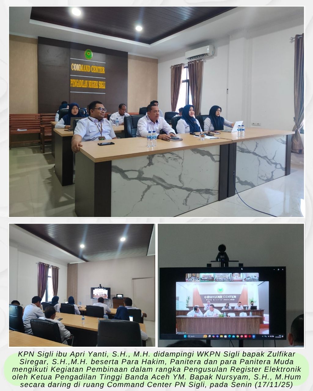 Sigli – Senin (17/11/25) Ketua Pengadilan Negeri Sigli ibu Apri Yanti, S.H., M.H. didampingi Wakil Ketua Pengadilan Negeri Sigli bapak Zulfikar Siregar, S.H., M.H. serta Para Hakim, Panitera dan Para Panmud mengikuti Pembinaan Kelengkapan Persyaratan Register Elektronik Pengadilan Negeri oleh Ketua Pengadilan Tinggi Banda Aceh YM. Nursyam, S.H., M.Hum. secara daring di ruang Command Center PN Sigli.