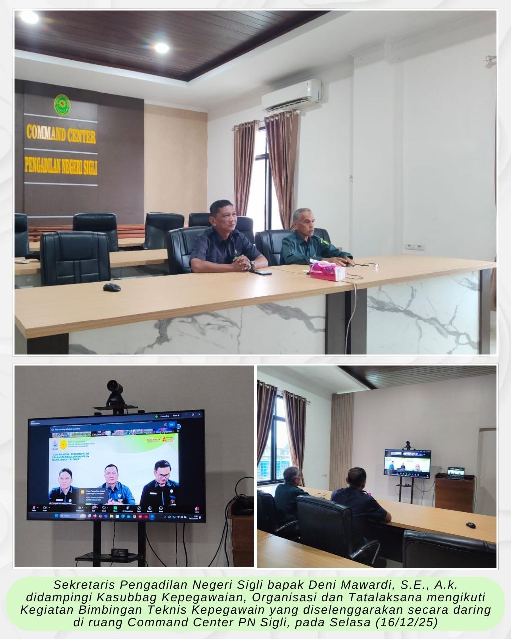 Sigli – Selasa (16/12/25) Sekretaris Pengadilan Negeri Sigli bapak Deni Mawardi, S.E., A.k. didampingi Kasubbag Kepegawaian, Organisasi dan Tatalaksana mengikuti Kegiatan Bimbingan Teknis Kepegawain yang diselenggarakan secara daring di ruang Command Center PN Sigli.