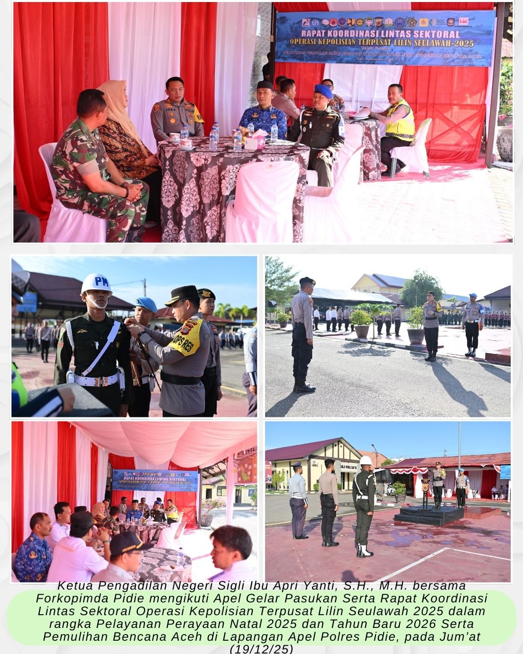 Sigli – Jum’at (19/12/25) Ketua Pengadilan Negeri Sigli Ibu Apri Yanti, S.H., M.H. bersama Forkopimda Pidie mengikuti Apel Gelar Pasukan Serta Rapat Koordinasi Lintas Sektoral Operasi Kepolisian Terpusat Lilin Seulawah 2025 dalam rangka Pelayanan Perayaan Natal 2025 dan Tahun Baru 2026 Serta Pemulihan Bencana Aceh di Lapangan Apel Polres Pidie.