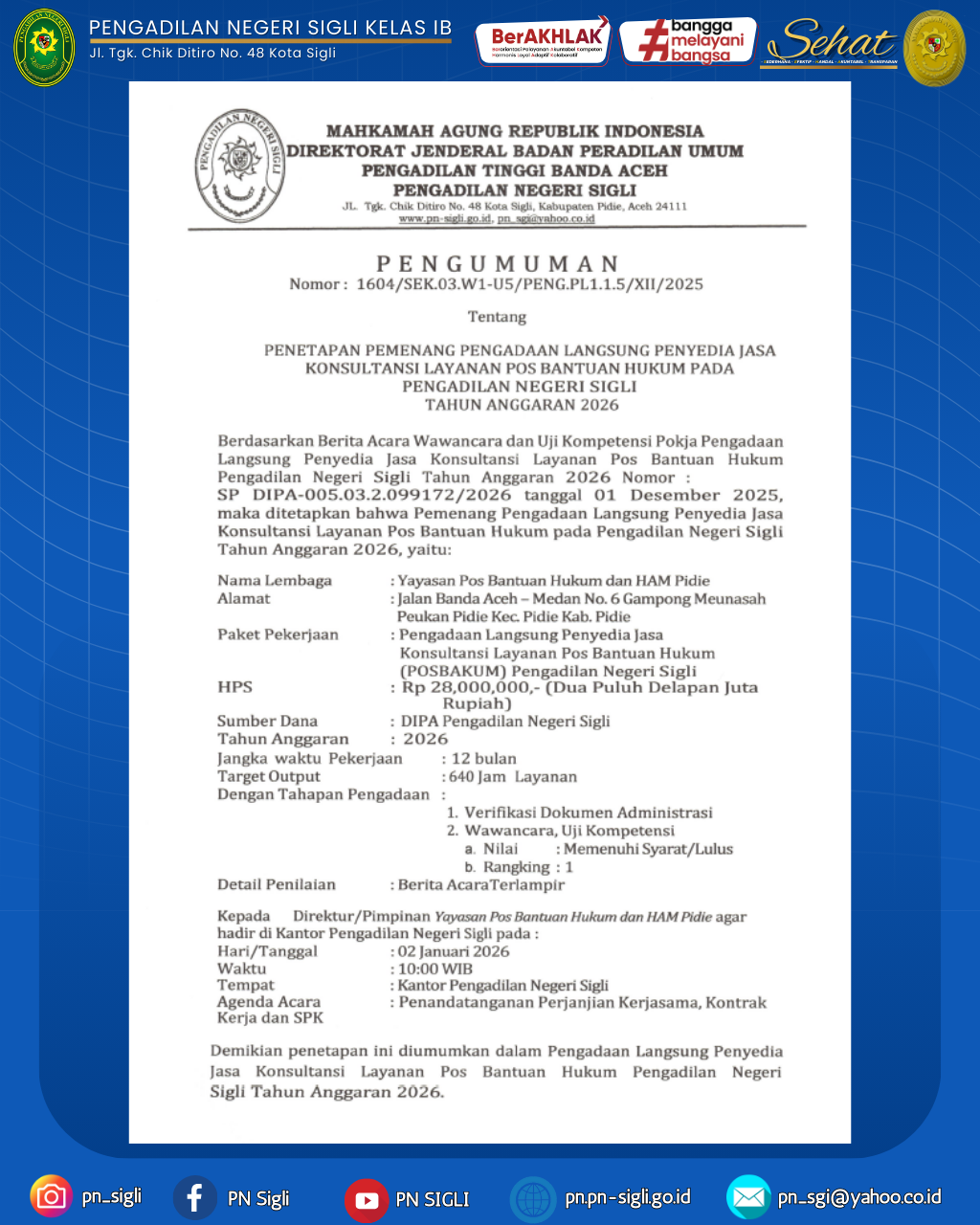 PENGUMUMAN PENETAPAN PEMENANG PENGADAAN LANGSUNG PENYEDIA JASA KONSULTASI LAYANAN POS BANTUAN HUKUM PADA PENGADILAN NEGERI SIGLI TAHUN ANGGARAN 2026