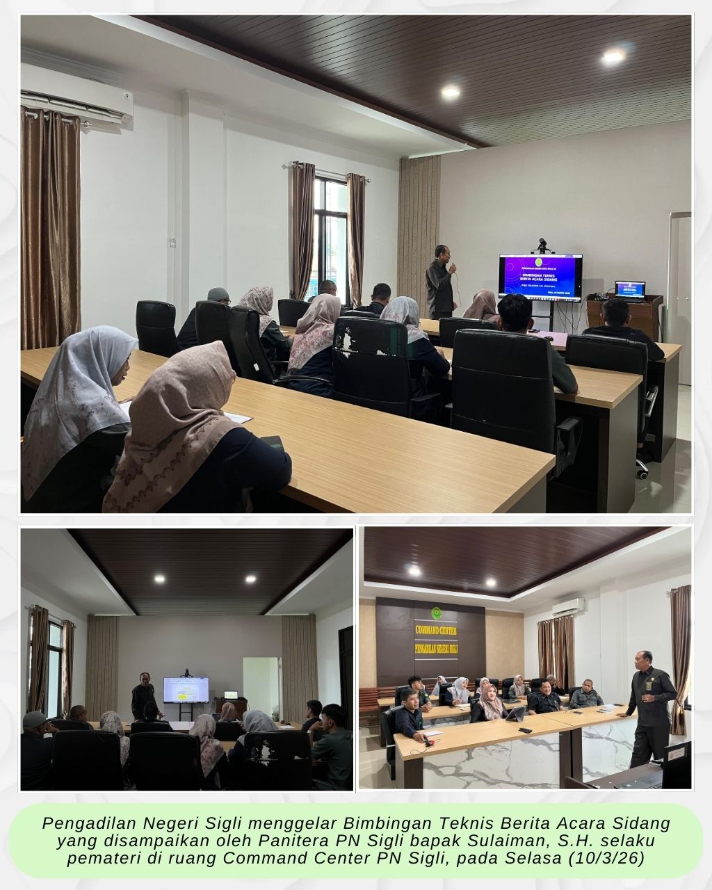 Sigli – Selasa (10/3/26) Pengadilan Negeri Sigli menggelar Bimbingan Teknis Berita Acara Sidang yang disampaikan oleh Panitera PN Sigli bapak Sulaiman, S.H. selaku pemateri di ruang Command Center PN Sigli.