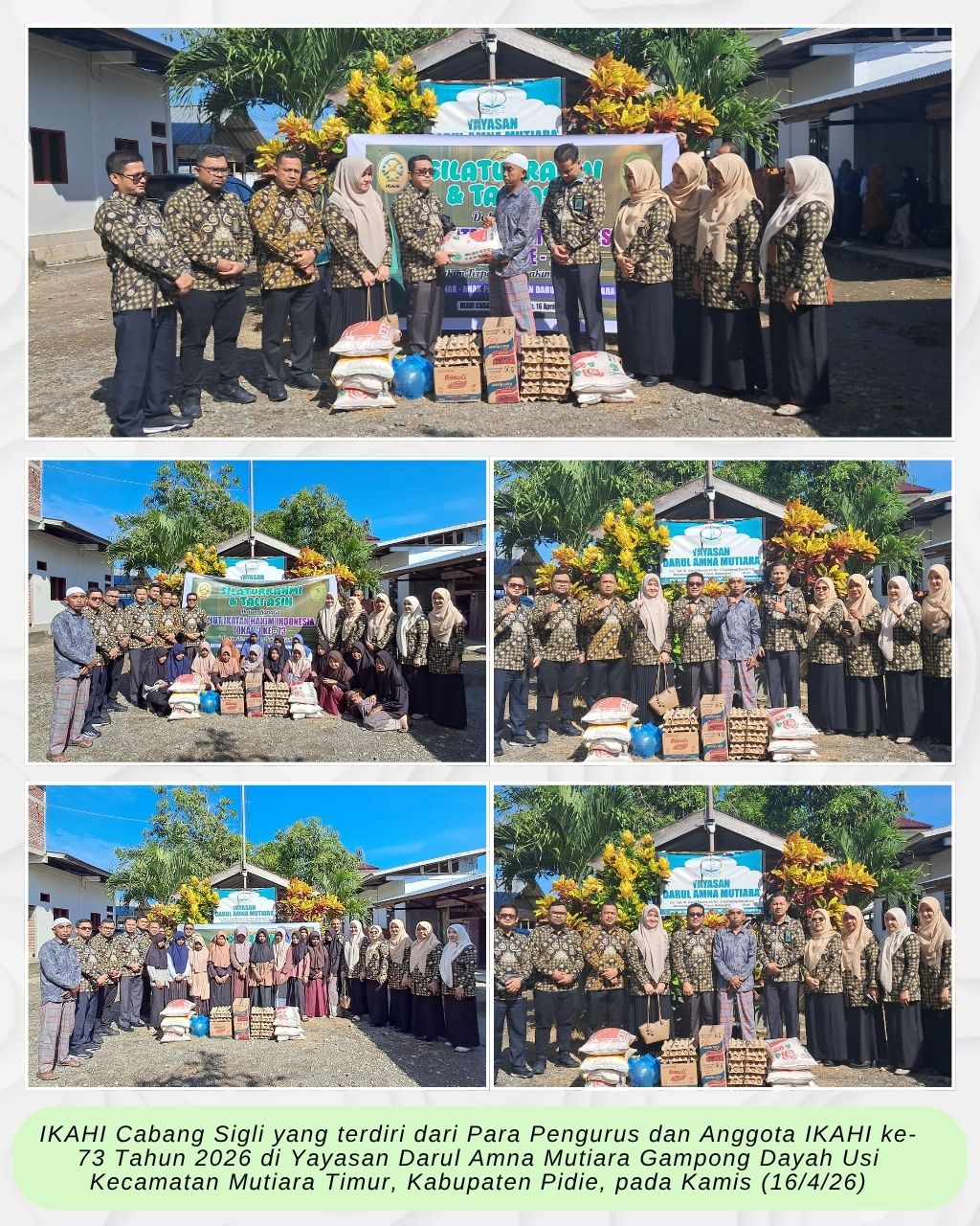 Sigli – Kamis (16/4/26) IKAHI Cabang Sigli yang terdiri dari Para Pengurus dan Anggota IKAHI (Hakim Pengadilan Negeri Sigli dan Hakim Mahkamah Syar’iyah Sigli) menggelar Silaturahmi dan Tali Asih dalam Rangka HUT IKAHI (Ikatan Hakim Indonesia) ke-73 Tahun 2026 di Yayasan Darul Amna Mutiara Gampong Dayah Usi Kecamatan Mutiara Timur, Kabupaten Pidie.