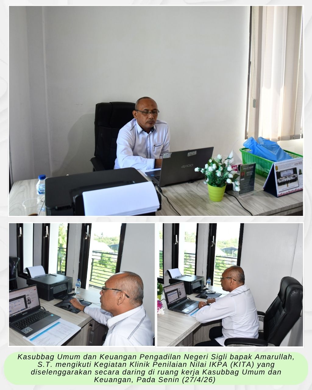 Sigli – Senin (27/4/26), Kasubbag Umum dan Keuangan Pengadilan Negeri Sigli bapak Amarullah, S.T. mengikuti Kegiatan Klinik Penilaian Nilai IKPA (KITA) yang diselenggarakan secara daring di ruang kerja Kasubbag Umum dan Keuangan.